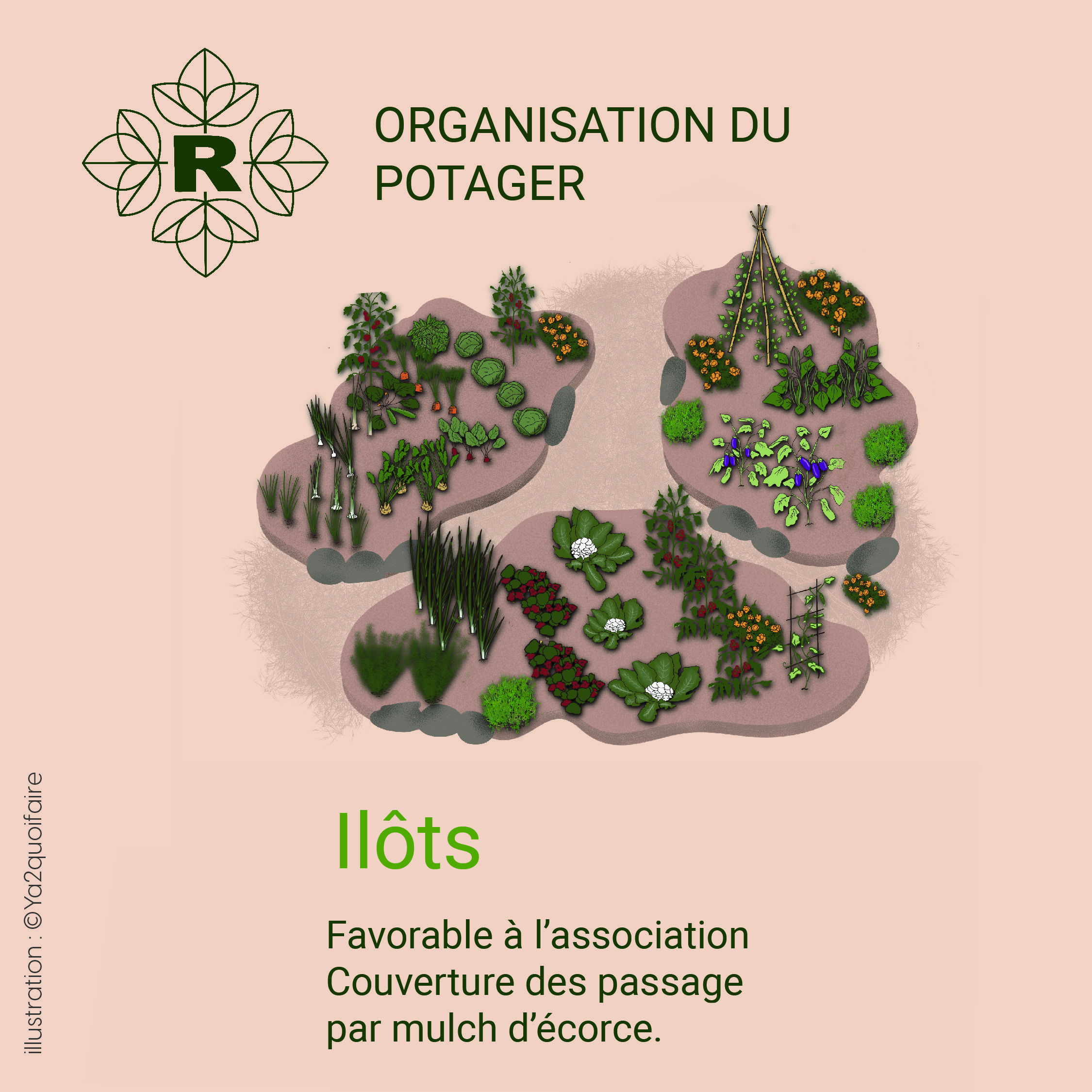 Le jardin en îlots consiste à regrouper les cultures en petites zones séparées, comme de petites “îles” végétales. Entre chaque îlot, on laisse un passage recouvert de mulch d’écorce ou d’un autre paillage organique. Cela permet de créer un chemin naturel et confortable tout en conservant l’humidité du sol et en limitant la pousse des mauvaises herbes.